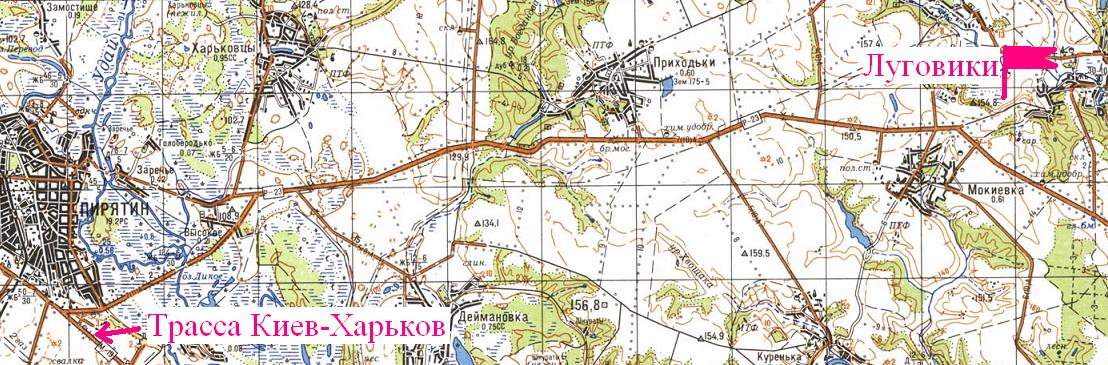 Через Пирятин, правый поворот с Харьковской(как я понимаю) трассы. N50 02 56.2 E32 53 49.5